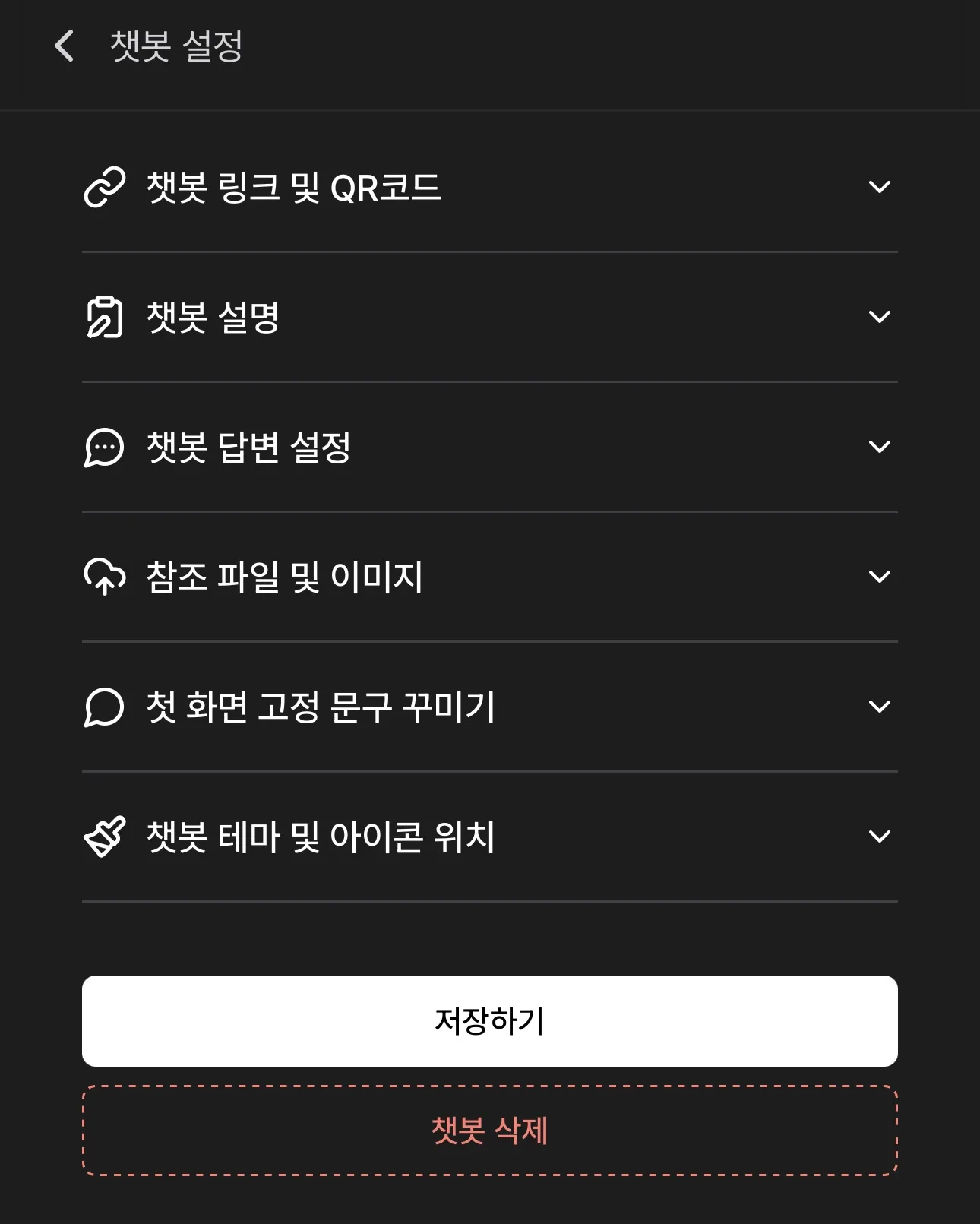 또한 챗봇 설정이하나의 카테고리에 너무 많이 몰려있어서 조작이 어렵단 피드백을 반영해서 여러 카테고리로 쪼개서 각 카테고리 별로 최소한의 설정만 보실 수 있도록 개선 해놓았어요.