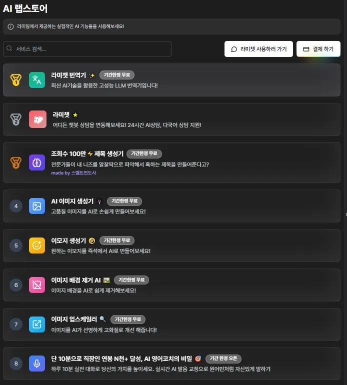 라미랩스토어는 다양한 AI 앱과 AI 도구를 한 곳에서 쉽게 찾아보고 활용할 수 있는 공간이에요. 이제 라미챗 사용자들은 다양한 유용한 앱과 도구를 한 번에 탐색하고, 원하는 기능을 손쉽게 설치하거나 사용할 수 있답니다!